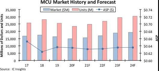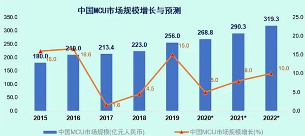 據權威市調機構統計預測,2020年全球MCU市場規模約為177.9億美元,出貨量超過280億顆。預計今年的MCU規模將達到184.8億美元,從2021至2028年的復合年增長率(CAGR)為10.1%,2028年將增長到361.6億美元。另據IC Insights報告顯示,MCU全球營收在2018年創下空前紀錄,達到176億美元;2019年下滑7%;2020年繼續下降8%,至149億美元。2020年車用MCU銷售額為60億美元;工業MCU營收占比為29%,約為43億美元。預計2021年全球MCU市場總銷售額可達到190億美元,其中汽車和工業市場占據了70%,消費電子、家電,以及計算機和通信等市場占據了剩下的30%。