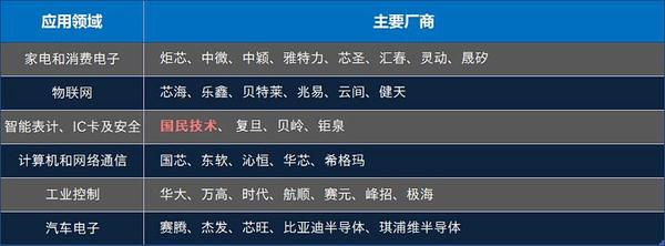 我們將中國MCU市場按應用領域大致分為六個類別,分別是:家電和消費電子、物聯網、智能表計/IC卡和安全、計算機和網絡通信、工業控制、汽車電子。下表列出了每個應用類別的主要國產MCU廠商。
