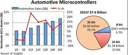 預計全球汽車MCU銷售額將在2021年猛增23%,達到創紀錄的76億美元,隨后2022年將增長14%,2023年增長約為16%。