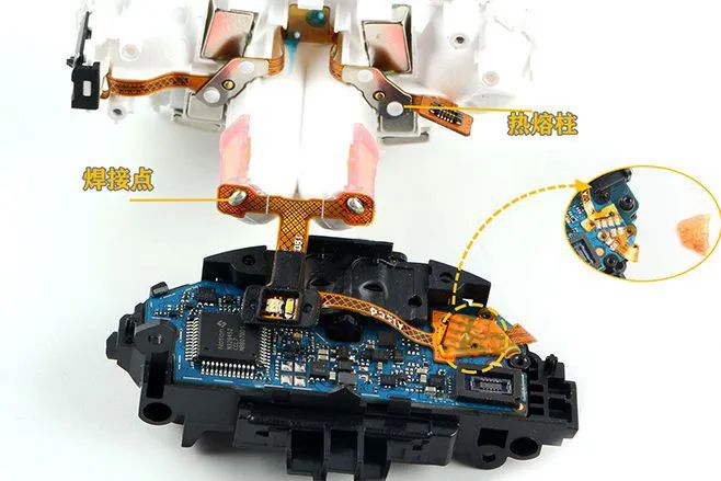 整個內部有多條FPC軟板,內支撐頂部的充電頂針FPC通過熱熔柱固定,底部的充電彈片更是直接焊接在FPC上。主板上面LED軟板和電池FPC也是直接焊接在主板上面的,焊接處還涂有黃色固定膠。