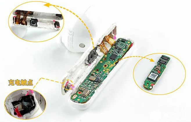 整理了全部的IC,發現耳機加上充電盒芯片全部為國產芯片。藍牙天線是PCB板載天線,直接畫在主板上面,觸摸以及佩戴檢查使用的是匯頂的電容式入耳檢測及觸控方案。耳機充電焊盤一個直接焊接在主板上面,另一個在FPC軟板上面。