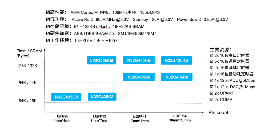 國民技術N32G435系列采用32 bit ARM Cortex-M4F內核,最高工作主頻108MHz,支持浮點運算和DSP指令,集成高達128KB嵌入式加密Flash,32KB SRAM,集成豐富的高性能模擬器件,內置1個12bit 5Msps ADC,2路獨立軌到軌運算放大器,2個高速比較器,1個1Msps 12bit DAC,支持多達20通道電容式觸摸按鍵,集成多路U(S)ART、I2C、SPI、USB、CAN等數字通信接口,內置多種密碼算法硬件加速引擎。