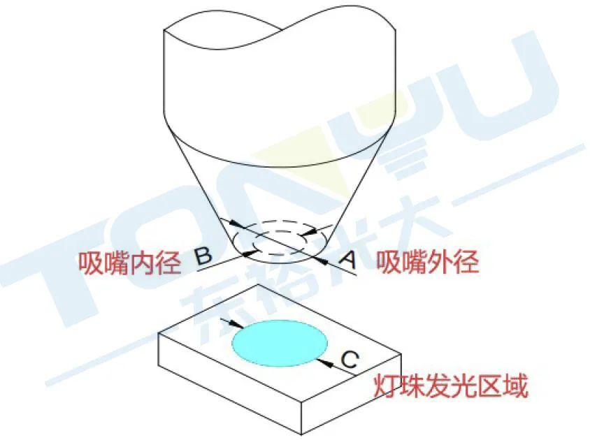 B 吸嘴內徑>C LED敏感區域 / A<燈珠表面