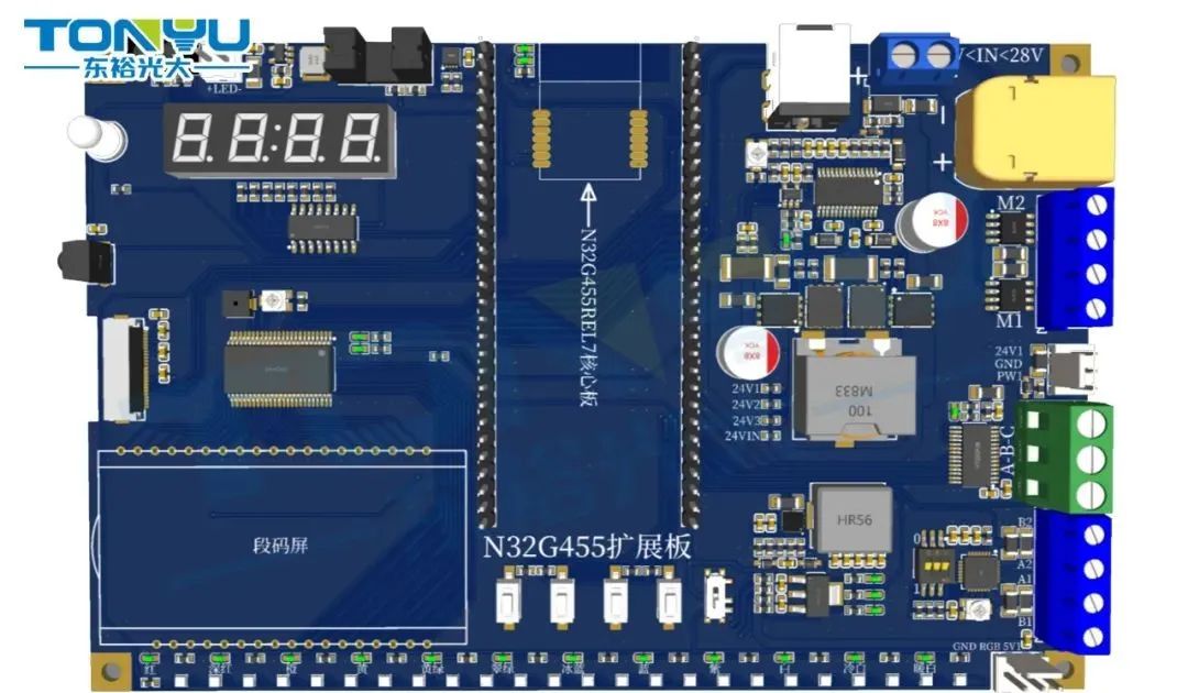 該產品是由深圳東裕光大電子有限公司進行開發,本產品主控芯片為 N32G455REL7, 作為核心板,有段碼屏,點陣屏,數碼管,RGB 燈帶,雙極性步進電機驅動,三相無刷電機驅動,PWM 電機驅動,直流電機驅動,紅外接收等應用,在本產品中示例化的是演示各種模塊, 支持二次開發。