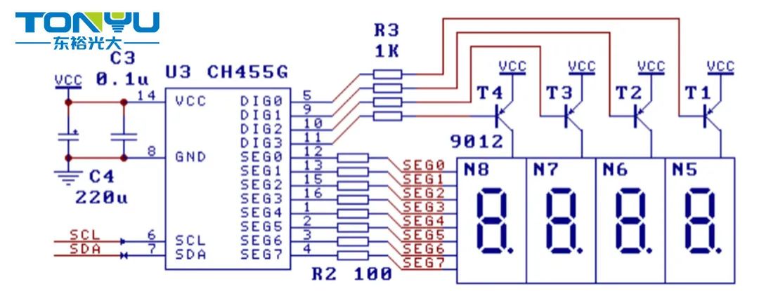 驅動芯片使用的是 CH455G 的 I2C 協議驅動共陽數碼管