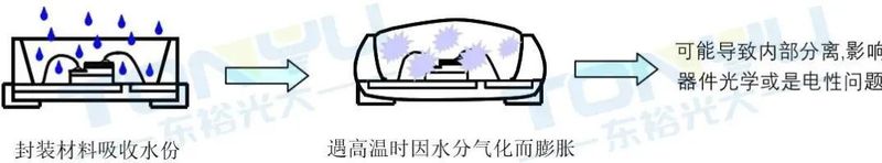LED器件產品長期暴露在常規環境中,環氧樹脂封裝部份內部比較容易吸收外部環境中水分,在遇到高溫焊接過程中,容易內部水氣受熱而膨脹, 有可能造成膠體與支架介面處出現剝離,或是內部芯片與支架介面處出現分離,從而有可能產生接觸不良產生內阻造成產生亮度低的現象.也有可能在長期點亮過程中如果產生發熱,再膨脹后出現剝離而出現器件失效不亮,在靜待冷卻后又復亮或是閃爍等現象。
