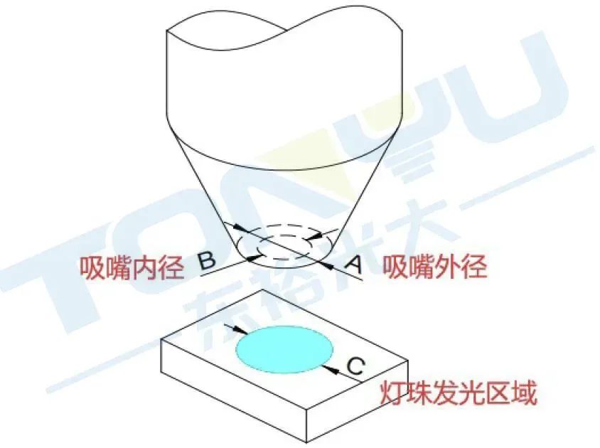 B 吸嘴內徑>C LED敏感區域 / A<燈珠表面