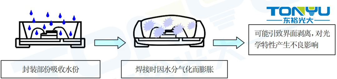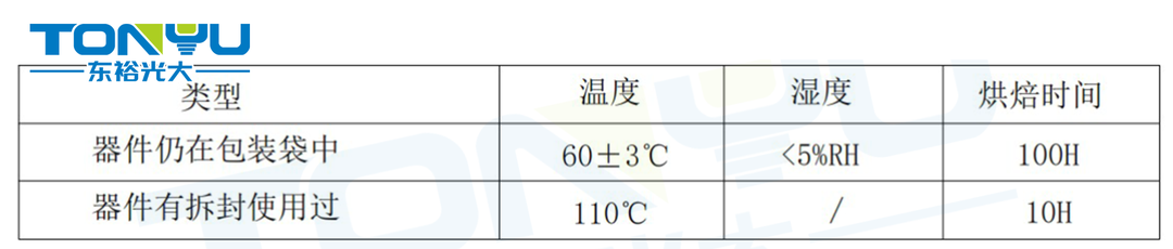 對于已經焊接于在 PCB 板上的 LED 器件的濕度控制:如果己經進行過一次焊接后不會再進行額外的回流焊或高溫過程,則不需要對安裝的器件濕氣敏感的 SMD 組件進行特殊處理。如果 PCB 將需要進行多次回流焊或其他焊接高溫過 程,包括返工,或是 SMD 組件的暴露時間累積過長,則需要在高溫過程時必須控制在指定的限制時間內.