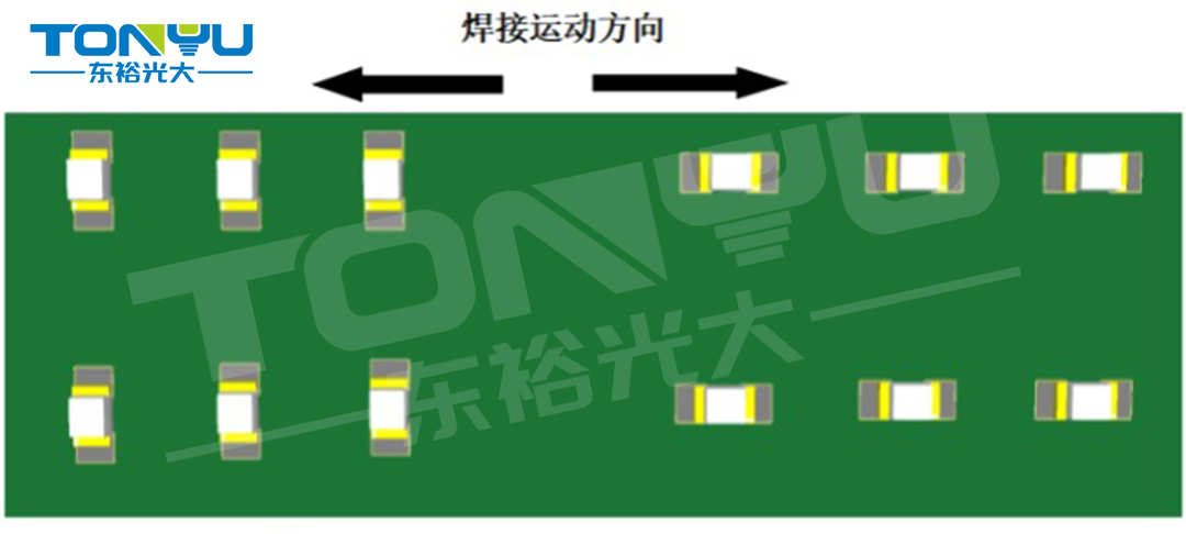 設計時 LED 良好的排布方向,避免過爐過程中出現立碑的現象而出現品質問題,還有根據實際的要求,器件避免靠近板邊,不然容易造成分板應力或是板邊過爐容易受到熱沖擊。