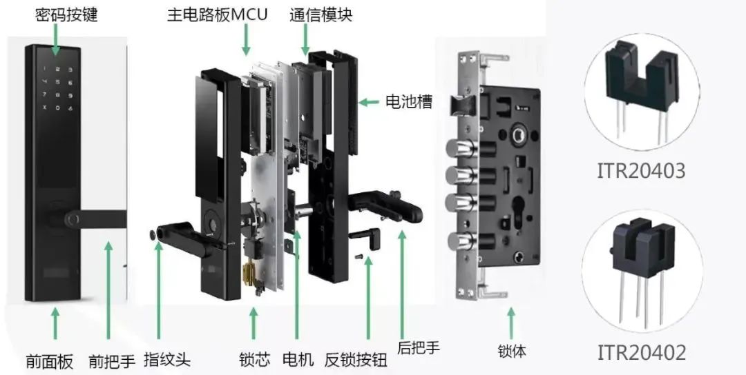 作為安防第一考量因素的智能門鎖也有使用到光電開關。一般智能門鎖使用的光電開關都為對射式光電開關,其作用是對門鎖進行位置檢測、和轉向檢測用。這里推薦使用ITR20403和ITR20402這兩款對射式光電開關,這兩款光電開關非常的適用于智能門鎖。