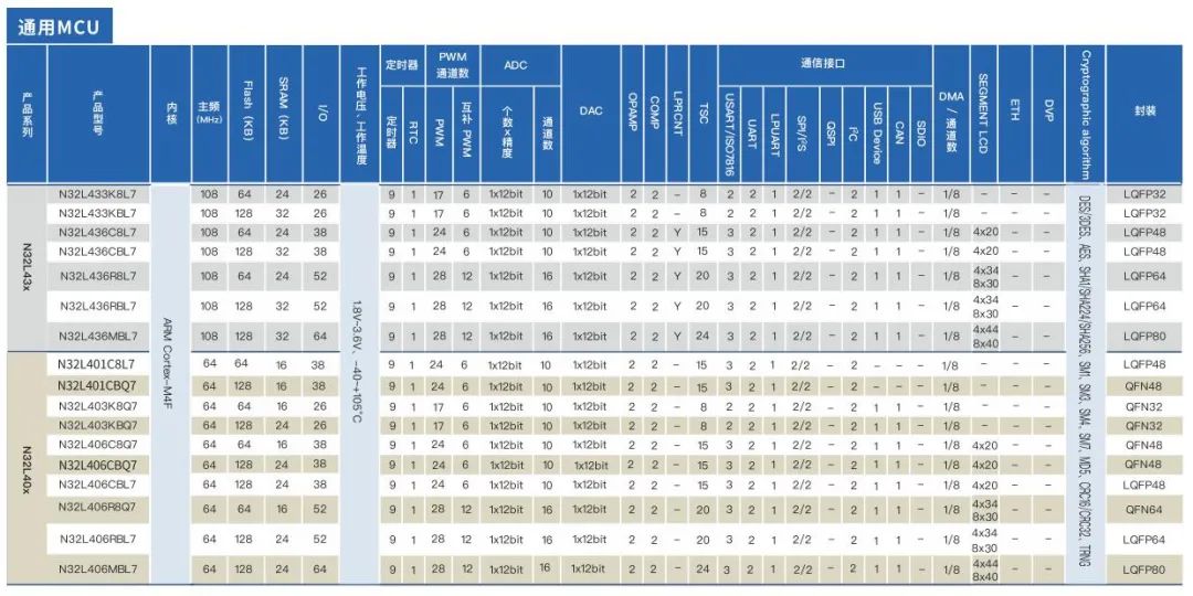 N32L43x、N32L40x系列采用業內領先的40nm制程工藝,在CPU性能、集成度、綜合能耗、安全性等方面具有明顯優勢,N32L436系列是國內首款在單芯片內集成了無磁傳感計量單元的超低功耗MCU,具有抗磁抗干擾等特色: