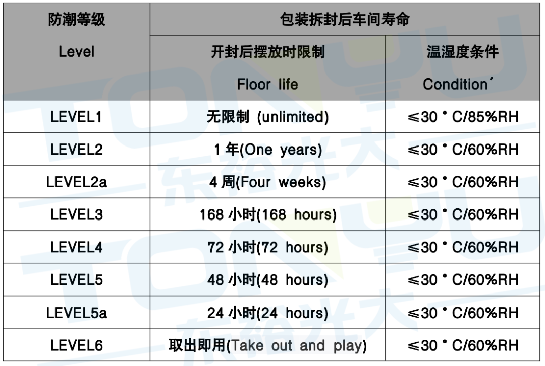 上表中濕敏等級 LEVEL5a 的產品,打開包裝超過 24 小時后,須烘烤完密封存儲,要求存儲環境溫度≤30°C,相對濕度60%RH。