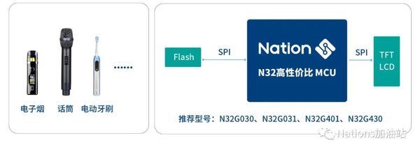 國民技術N32系列MCU已經在消費電子、家用電器、醫療儀器、汽車電子、工業設備等領域的顯示應用中獲得大量應用。在小尺寸彩屏顯示方案中,N32 MCU作為核心主控芯片使用,通過MCU提供的高速SPI接口連接TFT屏幕,高效便捷。芯片內置大容量SRAM和嵌入式加密Flash,支持大容量圖像數據存儲與流暢播放,可實現精準的TFT色彩控制和靈敏的響應,方寸之間盡顯炫酷大千世界。
