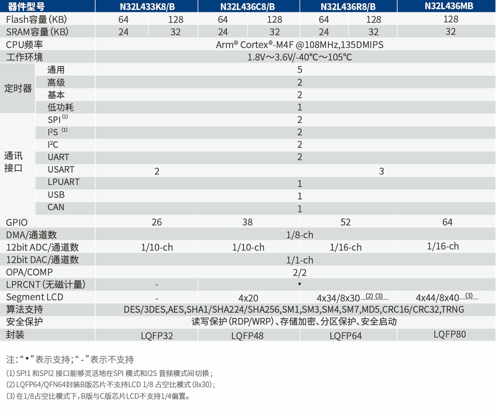 N32L43x系列采用32 bit Arm? Cortex?-M4F內核,最高工作主頻108MHz,支持浮點運算和DSP指令,集成高達 128KB嵌入式加密Flash,32KB SRAM,集成豐富的高性能模擬器件,內置1個12bit 5Msps ADC,2路獨立軌到軌 運算放大器,2個高速比較器,1個1Msps 12bit DAC,集成低功耗無磁流量計量模塊、集成多路U(S)ART、I2C、SPI、 USB、CAN等數字通信接口,Segment LCD驅動接口,內置多種密碼算法硬件加速引擎。